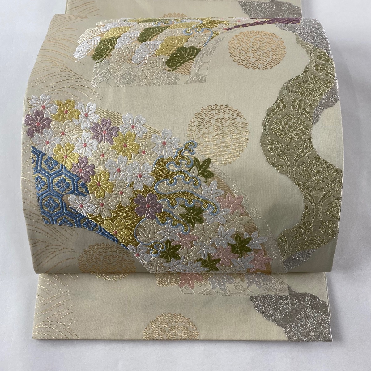 正規激安 松梅 扇面 名品 美品 袋帯 唐織 中古 正絹 六通 ベージュ 金銀糸 袋帯 Www Floridapace Gov